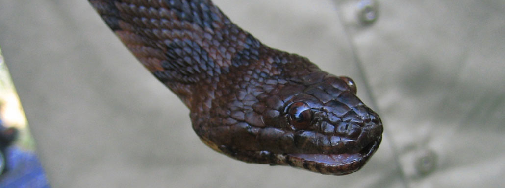 Common Watersnake- this non venomous snake is approximately 40-45 inches long. Its color varies and can be black, brown, gray, dark red and brown with the significantly lighter underbelly area.
